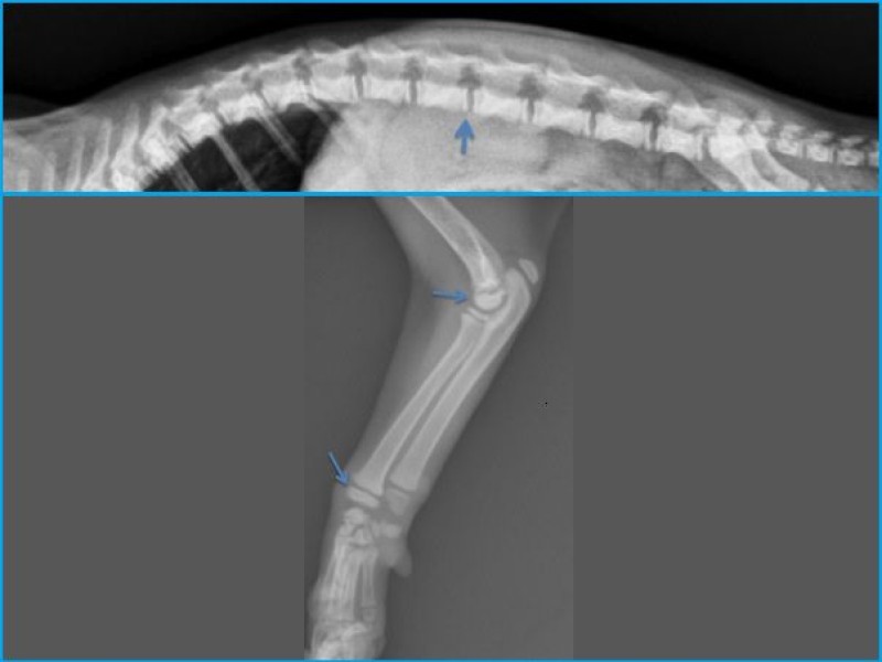 corps vertébraux et les os longs des chatons, accompagné d'un retard de maturation des os du carpe et du tarse. La dysgénésie épiphysaire se caractérise par un délai d'apparition des foyers d'ossifications épiphysaires, et en absence de supplémentation, les épiphyses apparaissent fragmentées avec des foyers de minéralisation dispersés. Normalement, les épiphyses se développe d'un centre unique. Plus tard, cette malformation hypophysaire conduit à des arthropathies dégénératives.